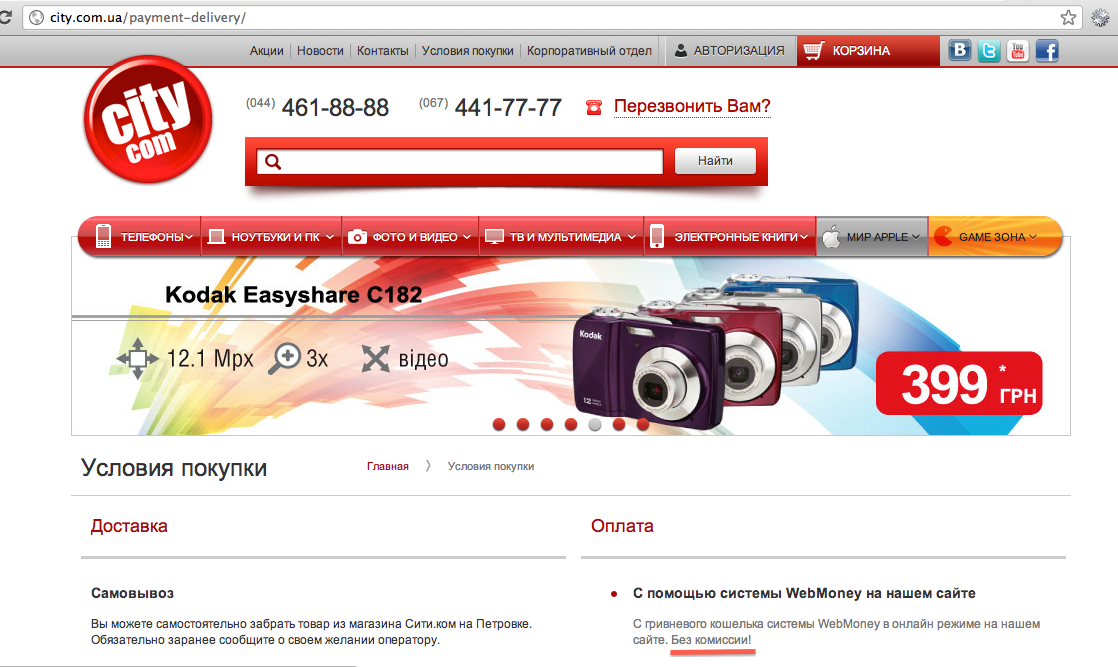 При посещении сайта city.com.ua я обратил внимание на большой баннер, гласивший «Вебмани без комиссии», и решил оплатить электронными деньгами. Вот собственно скриншот их сайта с баннером.